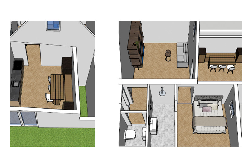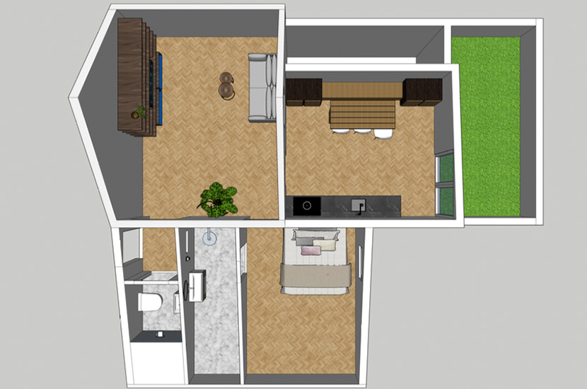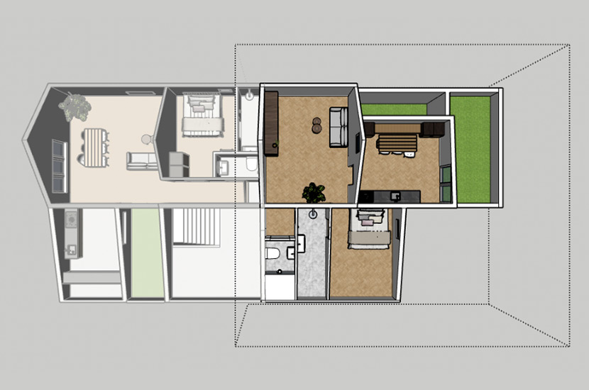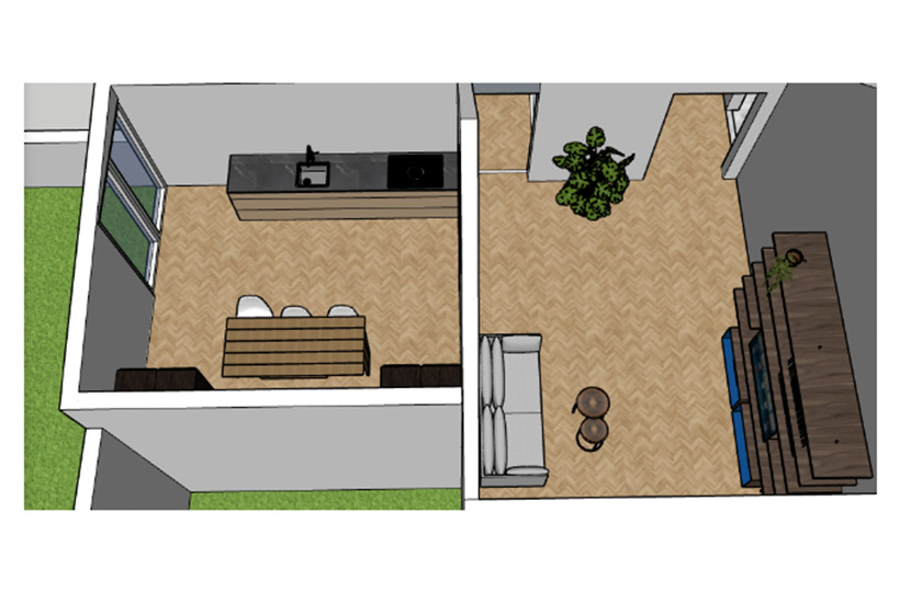 de leefruimte. Vanuit de ruime keuken is middels de dubbel openslaande deur toegang tot het balkon van 12 m2. De leefruimte heeft lichttoetreding van het raam in de punt van de achtergevel alsook van het dakraam.
