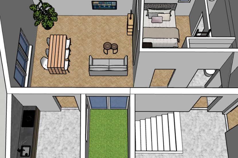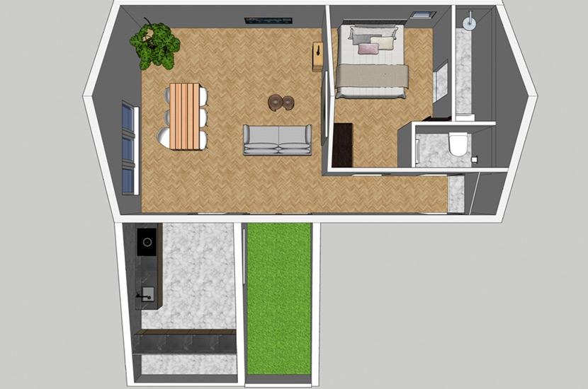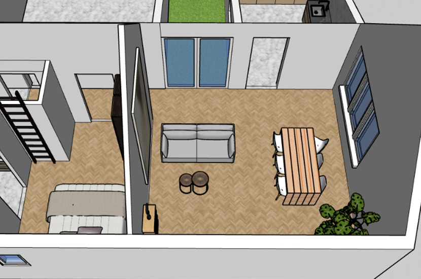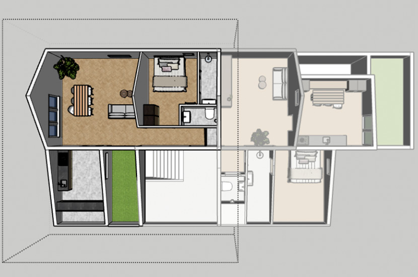 58 m2 op de eerste verdieping met een hoog plafond tot aan de nok. Door de ruime sparing in het dak zijn er naast buitenruimte ook lichtvlakken gecreëerd voor zowel de keuken als de leefruimte. Boven de badkamer en separate wc ruimte is een verlaagd plafond mogelijk voor bergruimte.